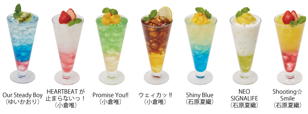 また、人気曲「Promise You!!」「NEO SIGNALIFE」「Shiny Blue」「ウェィカッ!!」「Shooting☆Smile」「HEARTBEATが止まらないっ!」「Our Steady Boy」をモチーフとして小倉唯さん、石原夏織さんがそれぞれプロデュースしたコラボドリンク(全7種)を680円(税別)にてご提供。1品ご注文につき、『ゆいかおり』のオリジナル撮り下ろし写真がデザインされたオリジナルコースター(全10種)を1枚プレゼントします。