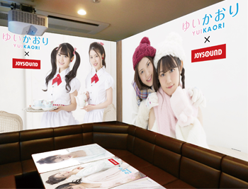 『ゆいかおり』スペシャルコラボルームの壁やテーブル、ドアの装飾には、カフェ店員をイメージした衣装や、暖かそうなコートに身を包んだ2人を収めたオリジナル撮り下ろし写真を採用。 室内の壁面のプロジェクターでは、昨年3月に日本武道館で公演された「RAINBOW CANARY!!」の映像を投影するなど、『ゆいかおり』一色に彩られた空間でカラオケをお楽しみいただけます。